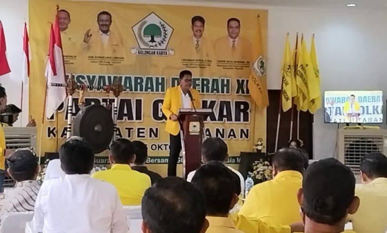 TABANAN, Matakompas.com | Musyawarah Daerah (Musda) DPD Partai Golkar Kabupaten Tabanan yang digelar di Gedung DPD Kabupaten Tabanan, pada Kamis (16/10/2025) menetapkan Ketua DPD Partai Golkar Kabupaten Tabanan, I Nyoman Wirya kembali memimpin secara aklamasi untuk periode 2025–2030. Uniknya, politisi asal Kerambitan ini menahkodai Golkar Tabanan untuk kali ketiga berturut-turut, padahal aturan partai berlambang beringin tersebut membatasi maksimal dua periode.
